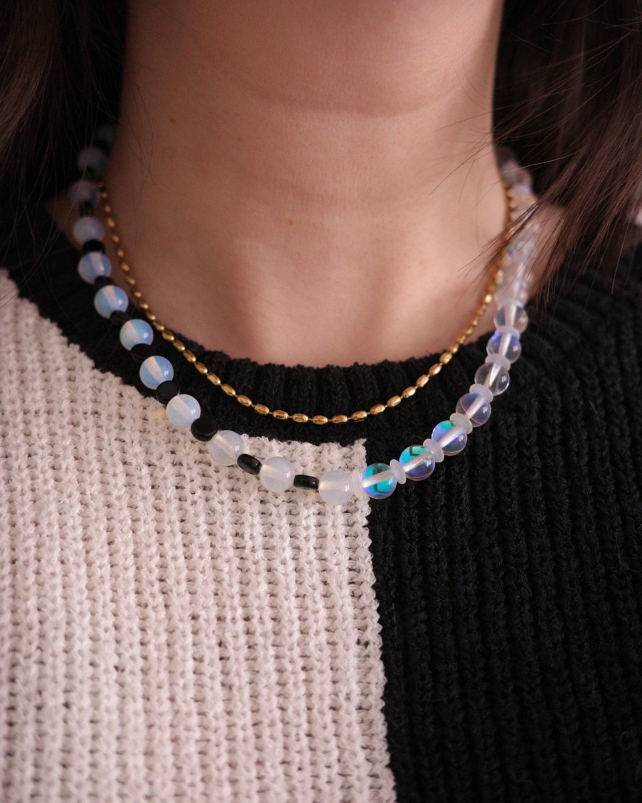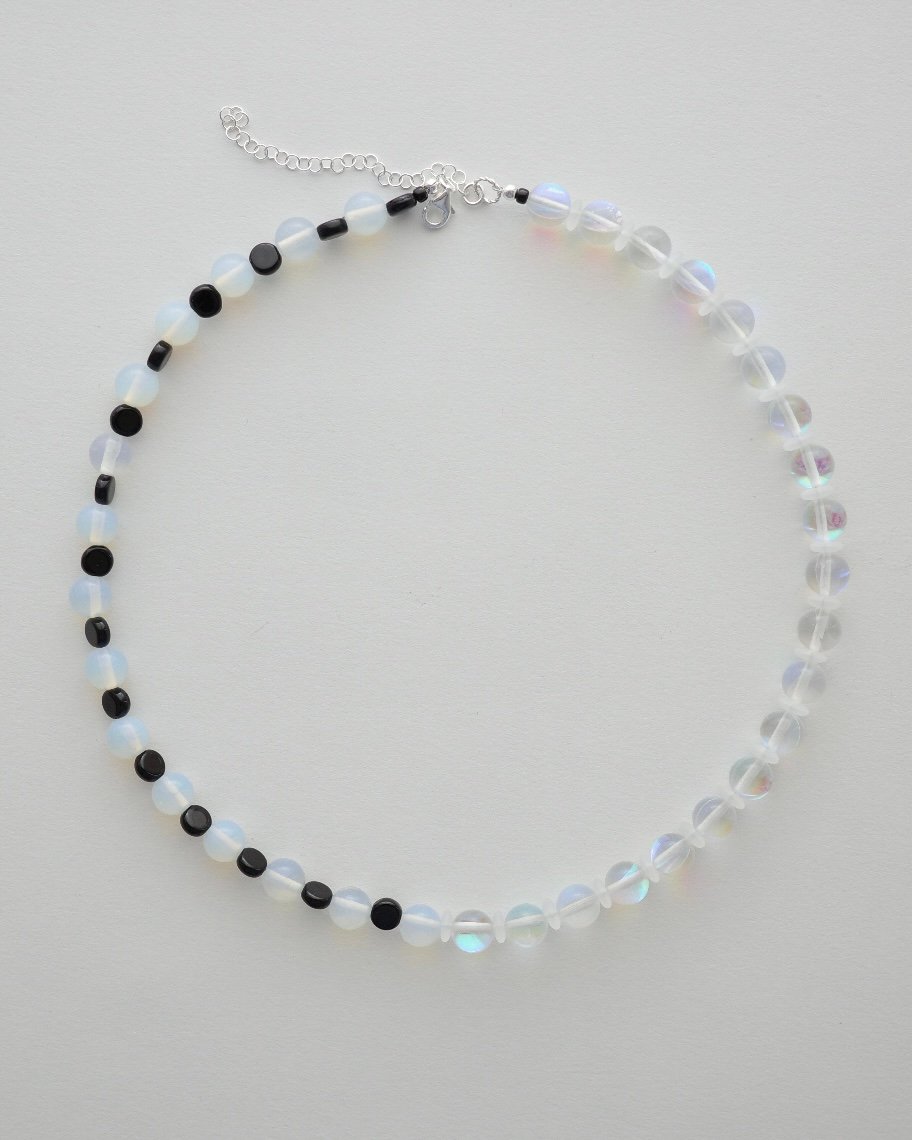 a beautiful mix of moonstone, moonlight aura quartz, glass beads & sterling silver